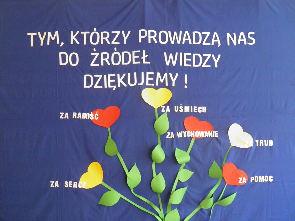 Na koniec uroczystości uczniowie indywidualnie złożyli życzenia i wręczyli nauczycielom kwiaty za przygotowanie których odpowiedzialny był Samorząd Uczniowski, którego pracami oczywiście kierowała p. Edyta Miąskowska. Uczniowie wręczyli także kwiaty i słodkie upominki swoim nauczycielom, za przygotowanie których była odpowiedzialna Rada Rodziców.