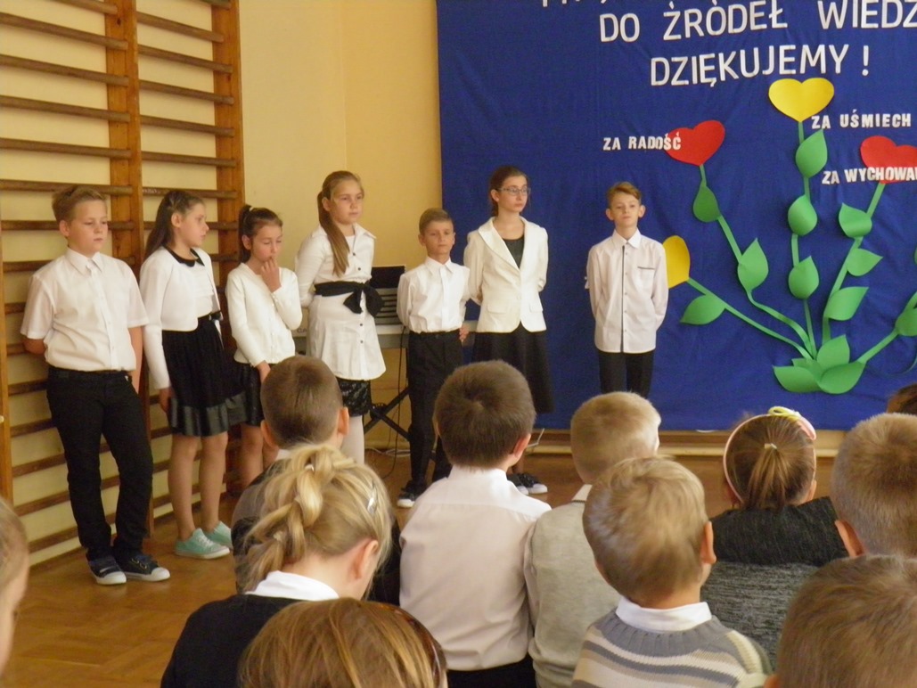 14 października 2016 r. uczniowie i nauczyciele przybyli do szkoły na obchody Dnia Edukacji Narodowej. Na uroczystość, której rozpoczęcie przewidziano na godzinę 10.00 przybyli również rodzice naszych uczniów oraz zaproszeni nauczyciele, którzy przez wiele lat szkolnych byli pracownikami szkoły. Kiedy wszyscy zebrali się na sali gimnastycznej, pani Dyrektor zabrała głos, witając przybyłych gości. Następnie oddała głos uczniom klasy IV – VI, którzy pod opieką właśnie Dyrektora szkoły przygotowywali program artystyczny. W części artystycznej uczniowie zaprezentowali nauczycielom kilka bardzo przydatnych pomocy, które mogą wykorzystać w swojej pracy. Dlatego też grono pedagogiczne przyglądało się występowi uczniów bardzo uważnie. Nauczyciele mogli się dowiedzieć m. in. że niezbędną pomocą dla nich może okazać się lornetka, która pozwoli zobaczyć dosłownie wszystko, lupa do rozszyfrowania pisma uczniów, worek grochu dla niesfornych podopiecznych, zestaw tabletek uspokajających oczywiście dla nauczyciela, tuba pełniąca funkcję rekwizytu nagłaśniającego dla belfra, parasol i palto przeciwdeszczowe chroniące przed uczniami oraz lusterko by nauczyciel mógł obserwować uczniów gdy pisze na tablicy. Ale to nie wszystko ponieważ dobrze przygotowany nauczyciel do lekcji, powinien posiadać jeszcze słuchawki, aparat fotograficzny oraz młotek. Część artystyczna z akcentami humorystycznymi sprawiła, że goście obejrzeli ją z dużym zainteresowaniem. W trakcie akademii nie zabrakło również życzeń jakie uczniowie skierowali do nauczycieli poszczególnych przedmiotów.