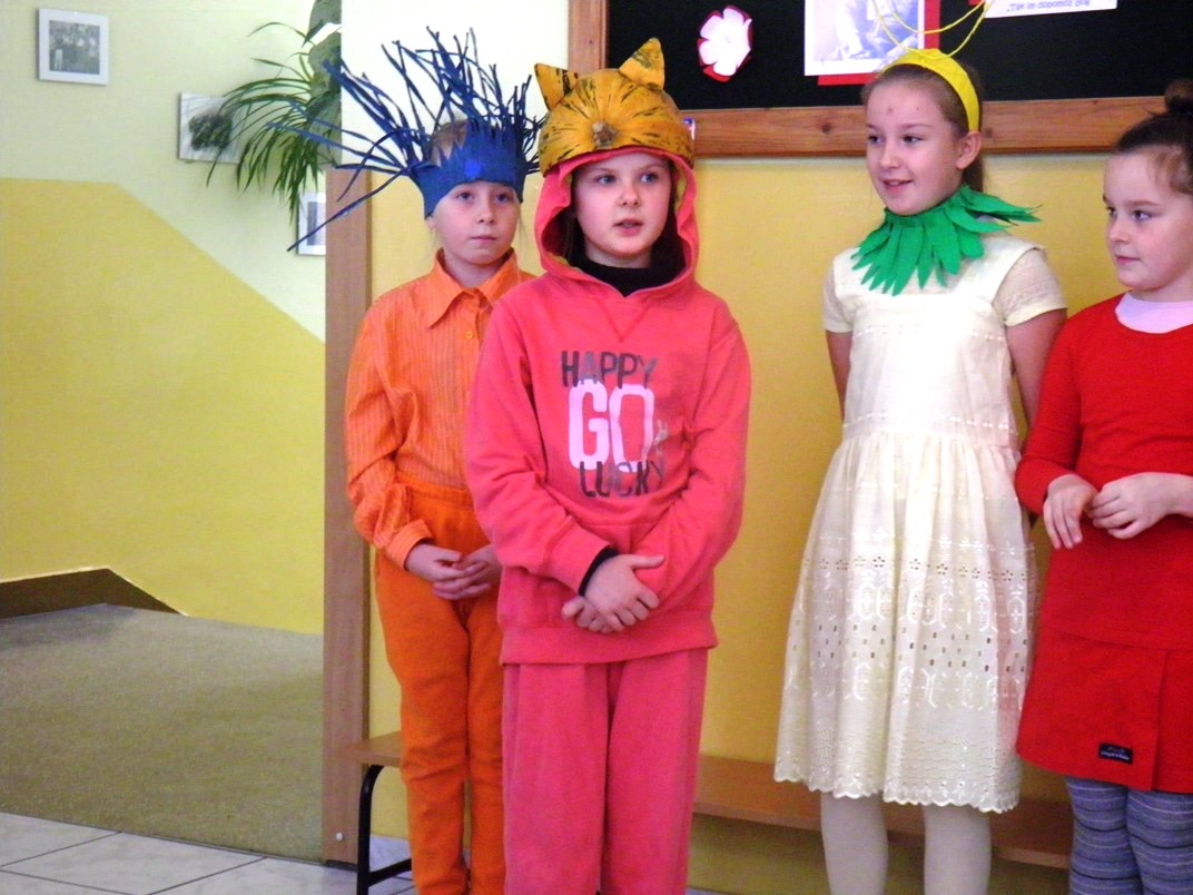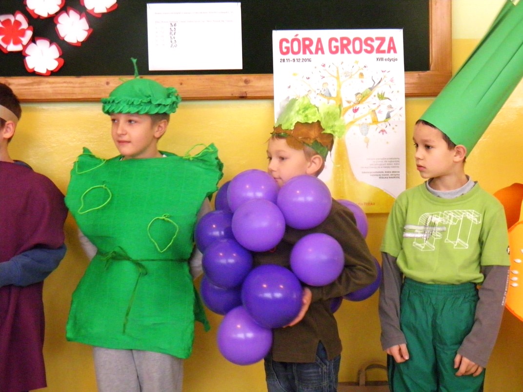 Uczniowie klas II – III w ramach programu „Owoce i warzywa w szkole” podjęli się kolejnego zadania. Drugoklasiści i trzecioklasiści przez tydzień planowali swoją pracę, by następnie przygotować strój dla wybranego przez siebie warzywa lub owocu. Dodatkowo musieli opracować krótki wiersz na temat prezentowanych owoców i warzyw. Uczniowie udowodnili, że aby wykonać zadanie powierzone przez nauczyciela wystarczają szczere chęci oraz pomysłowość. Podczas prezentacji można było zobaczyć stroje m. in. dla winogrona, dyni czy marchewki. Do akcji włączyli się roadzice uczniów, którzy wspomogli przygotowanie kreacji swoich pociech. Nauczycielem odpowiedzialnym za przeprowadzenie akcji była p. T. Baran.