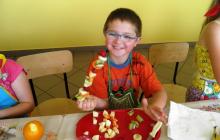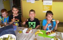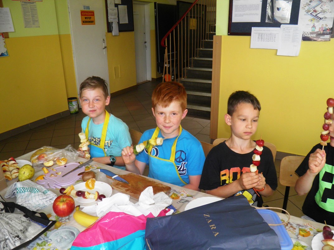 6 czerwca 2017 r. odbyły się warsztaty dla uczniów klas I – III, których celem było kształtowanie zasad zdrowego żywienia, uwrażliwianie na potrzebę spożywania zdrowych potraw i przekąsek oraz rozwijanie samodzielności wśród uczniów. Warsztaty poprowadziła p. E. Miąskowska i p. T. Baran. Wychowawczynie klas I – III zapoznały uczniów z tematyką i celami zajęć. Na potrzeby zajęć dzieci przyniosły banany, kiwi, winogrono białe i niebieskie, truskawki, brzoskwinie, mandarynki oraz jabłka. Następnie rozpoczęto przygotowywanie owoców do dalszej obróbki czyli krojenia na mniejsze kawałki. Ostatnim etapem zajęć było utworzenie „owocowych szaszłyków”. Uczniowie układali własne kompozycje owocowe jedni według kolorów inni według smaków. Po zakończeniu prac nastał najmilszy moment zajęć – konsumpcja efektów swojej pracy.
