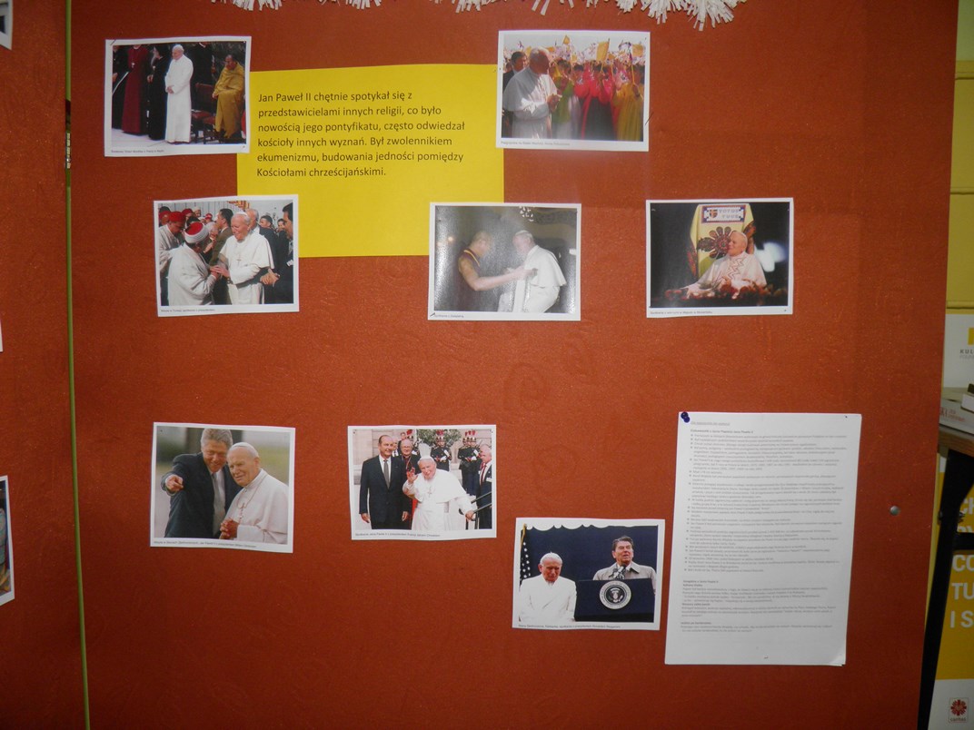 Opiekun Samorządu Uczniowskiego p. M. Warchoł przygotowała gazetkę tematyczną dotyczącą pielgrzymek i podróży jakie odbył św. Jan Paweł II podczas swojego pontyfikatu. W celu przybliżenia osoby św. Jana Pawła II, ksiądz K. Bochnak udostępnił prezentację multimedialną, którą można obejrzeć w programie Power Point 2013 lub 2016. Z prezentacją tą można zapoznać się również w formie pliku PDF.