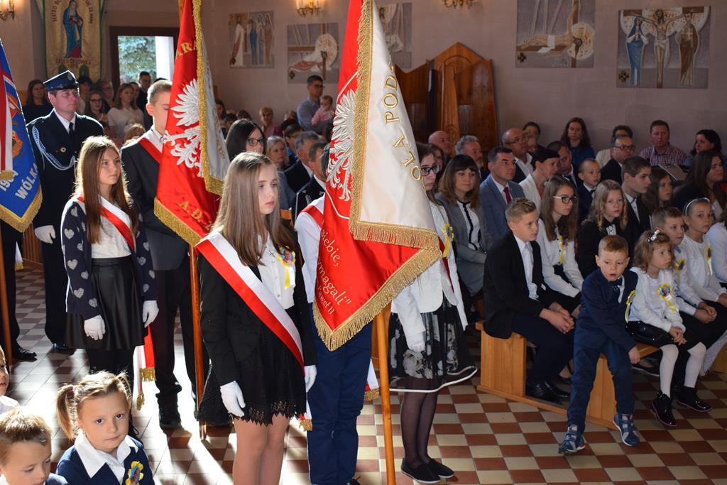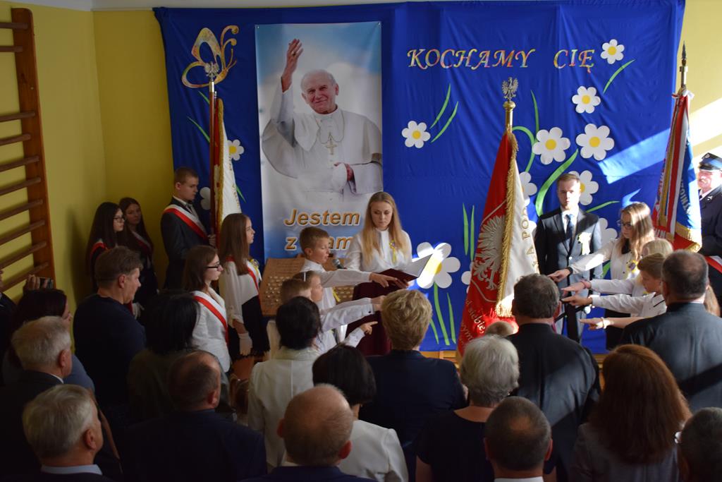 Następnym etapem uroczystości było przekazanie sztandaru Dyrektorowi szkoły. Nim to nastąpiło Przewodnicząca Rady Rodziców Pani Alicja Mazurkiewicz odczytała Akt Nadania Sztandaru Szkole, po czym przekazała go Pani Agnieszce Rożek. Wówczas to rodzice złożyli na ręce Dyrektora szkoły sztandar, który po krótkiej chwili został przekazany delegacji uczniowskiej. Kolejno odbyło się uroczyste ślubowanie przedstawicieli poszczególnych klas. Jednym z ostatnich punktów programu było odśpiewanie hymnu szkoły. Część oficjalna została zakończona przemówieniami gości przybyłych na uroczystość.