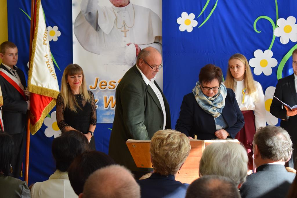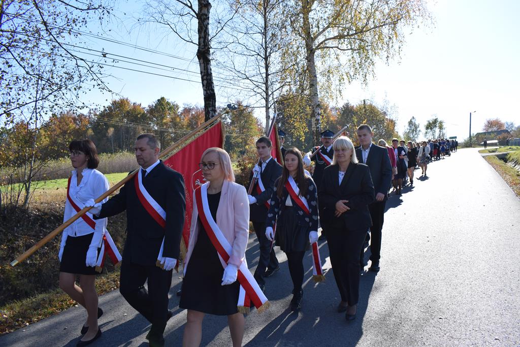 Przemarsz zakończono przy szkole podstawowej. Tam też miało miejsce uroczyste odsłonięcie pamiątkowej tablicy upamiętniającej samą uroczystość nadania szkole imienia oraz 50-lecie budowy szkoły. Odsłonięcia tablicy dokonała Pani Krystyna Wojtyło – Wójt Gminy Hyżne, Pani Monika Piątek – Przedstawiciel Kuratorium Oświaty w Rzeszowie, Pani Marlena Pleśniak – Zastępca przewodniczącego Rady Gminy oraz Pani Agnieszka Rożek – Dyrektor szkoły. Następnie tablica została poświęcona przez Dziekana Dekanatu ks. Jacka Rawskiego oraz proboszcza parafii ks. Mariana Fortunę.