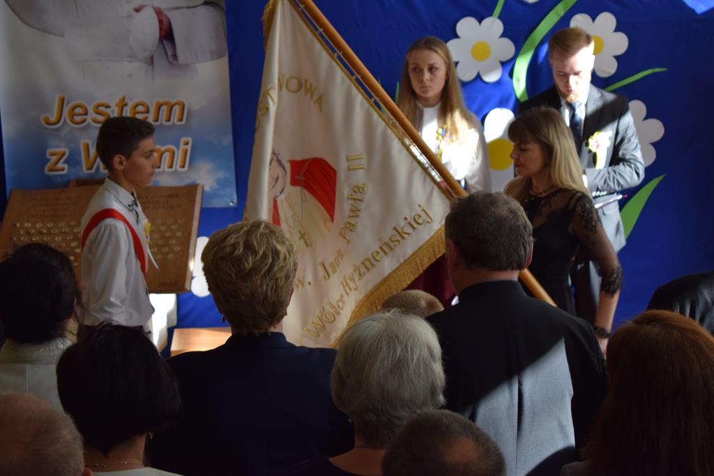Dnia 14 października 2018 roku odbyła się uroczystość nadania Szkole Podstawowej w Wólce Hyżneńskiej im. św. Jana Pawła II. Ceremonię rozpoczęto od mszy świętej, którą poprowadził Dziekan Dekanatu Błażowa ks. Jacek Rawski. W trakcie nabożeństwa odbyło się poświęcenie sztandaru szkoły i od tego momentu opiekę nad nim objęli uczniowie. Po zakończeniu liturgii zaprezentowano część artystyczną pt. „Droga do świętości Jana Pawła II”. Montaż słowno – muzyczny ukazywał jak wielkim człowiekiem za swojego życia był Jana Pawła II i jak wiele dobra uczynił będąc pośród nas. Po zakończeniu akademii uczestnicy opuścili świątynię. Przed kościołem został uformowany szyk składający się z Orkiestry Dętej OSP w Dylągówce, rodziców, którzy przejęli sztandar od uczniów, pocztu sztandarowego Szkoły Podstawowej im. św. Jana Kantego w Grzegorzówce, pocztu sztandarowego Ochotniczej Straży Pożarnej w Wólce Hyżneńskiej, uczniów naszej szkoły oraz wszystkich zaproszonych na uroczystość gości.