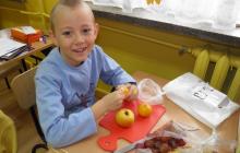 W dniach 23 i 24 października 2018 r. uczniowie klasy I realizowali projekt „Zdrowo jemy i rośniemy” w ramach którego odbyli wycieczkę do pobliskiego sklepu. Po powrocie rozmawiali na temat tego „Dlaczego powinniśmy jeść warzywa i owoce?”. Wykonywali też prace plastyczne pt. „Piramida zdrowego stylu życia” oraz pracę zbiorową pt. „Gotujemy zupę jarzynową”. Nazwy warzyw i owoców pierwszaki utrwalali poprzez grę „Witaminowe bingo”. Nauczyli się też piosenki o zdrowym żywieniu pt. „Sałatka” Podsumowaniem projektu było przygotowanie zdrowego posiłku – smakowitych szaszłyków owocowych.