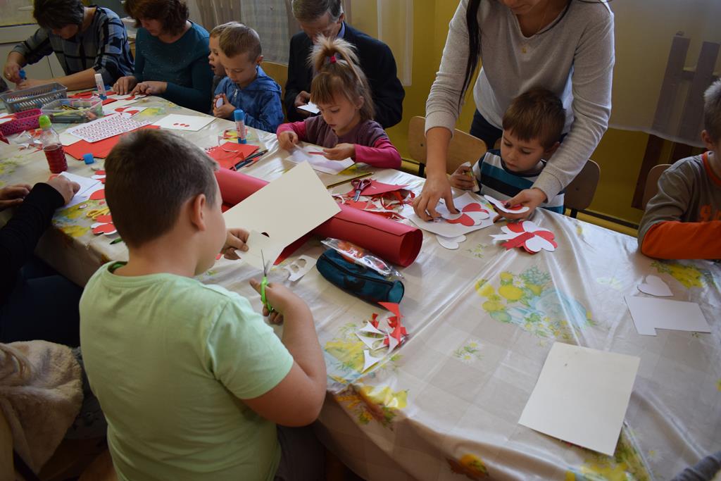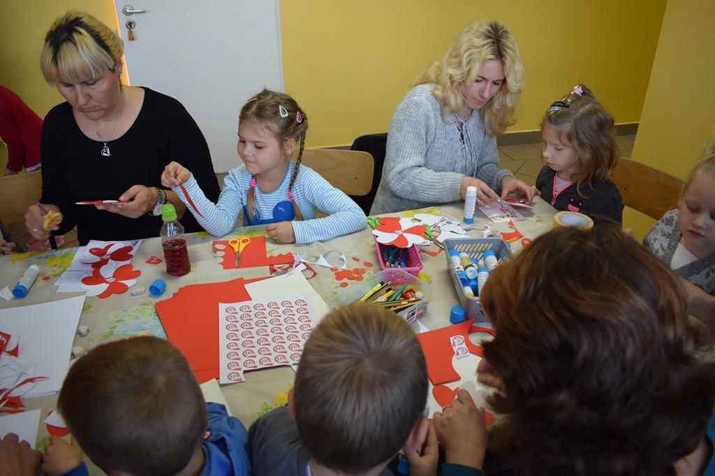 Równolegle tego dnia odbyły się warsztaty dla dzieci przedszkolnych i uczniów klas I – III. Na warsztaty te zostali zaproszeni także opiekunowie maluchów i dziadkowie. Celem spotkania było wykonanie kotylionów na uroczystość 100 – lecia odzyskania przez Polskę niepodległości. Aby wykonać to zadanie w pierwszej kolejności należało odrysować i wyciąć poszczególne elementy wchodzące w skład kompozycji utrzymane w kolorystyce biało – czerwonej. Następnie maluchy z pomocą opiekunów zajęły się sklejaniem tych elementów. Praca uczniów w trakcie warsztatów przebiegała pod okiem wychowawców.