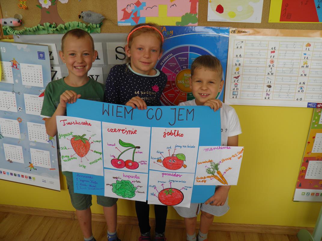 18 czerwca 2019 roku pierwszoklasiści byli zapoznawani z tematyką zdrowego odżywiania się. Pod opieką wychowawcy p. T. Baran wykonywali plakat. Na plakacie tym zaprezentowali wybrane przez siebie owoce i warzywa. Uczniowie starali się wskazać także w jakich posiłkach spożywanych na co dzień znajdują się wybrane owoce i warzywa.