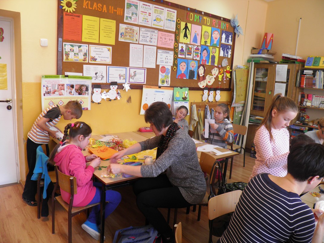 18 marca w naszej szkole odbyły się warsztaty plastyczne prowadzone przez nauczycieli oddziału „O” – I oraz II – III. Na warsztaty zostali zaproszeni rodzice uczniów, którzy wspólnie ze swoimi pociechami prężnie pracowali tworząc ozdoby świąteczne z okazji zbliżających się Świąt Wielkanocnych. Większość z uczestników zajęła się ozdabianiem styropianowych jajek, ale były też prace, w których na bazie styropianowego jajka, nieco większego stworzona baranka wielkanocnego. Jedna z mam wspólnie z swoją córką wykonała także małą palemkę. W grupie uczniów starszych, którzy byli również wspierani przez rodziców tworzona także pisanki wielkanocne, które ułożono w specjalnie przygotowanych koszykach. Uczestnicy warsztatów wykazali się dużą cierpliwością, zwłaszcza ci najmniejsi. Uczniowie udowodnili po raz kolejny, że jeżeli się odpowiednio wytrwale pracuje można osiągnąć wspaniałe rezultaty, czego świadectwem są wykonane prace.