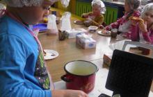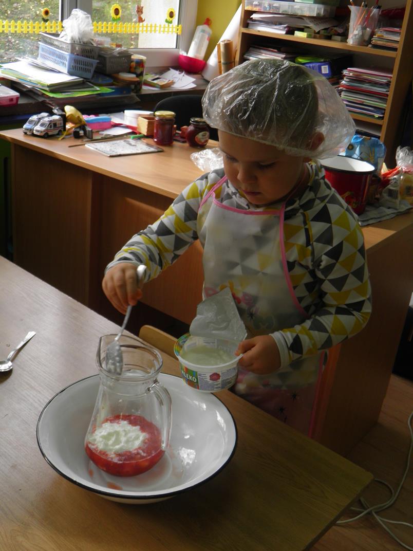 Z wielkim zainteresowaniem obsługiwały też urządzenia kuchenne, które pod opieką wychowawczyni posłużyły do przygotowania koktajlu mleczno – truskawkowego oraz gofrów. Próbowały też zrobić popcorn. Lekcja ta długo pozostanie w pamięci dzieciaczków.