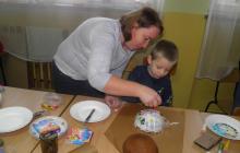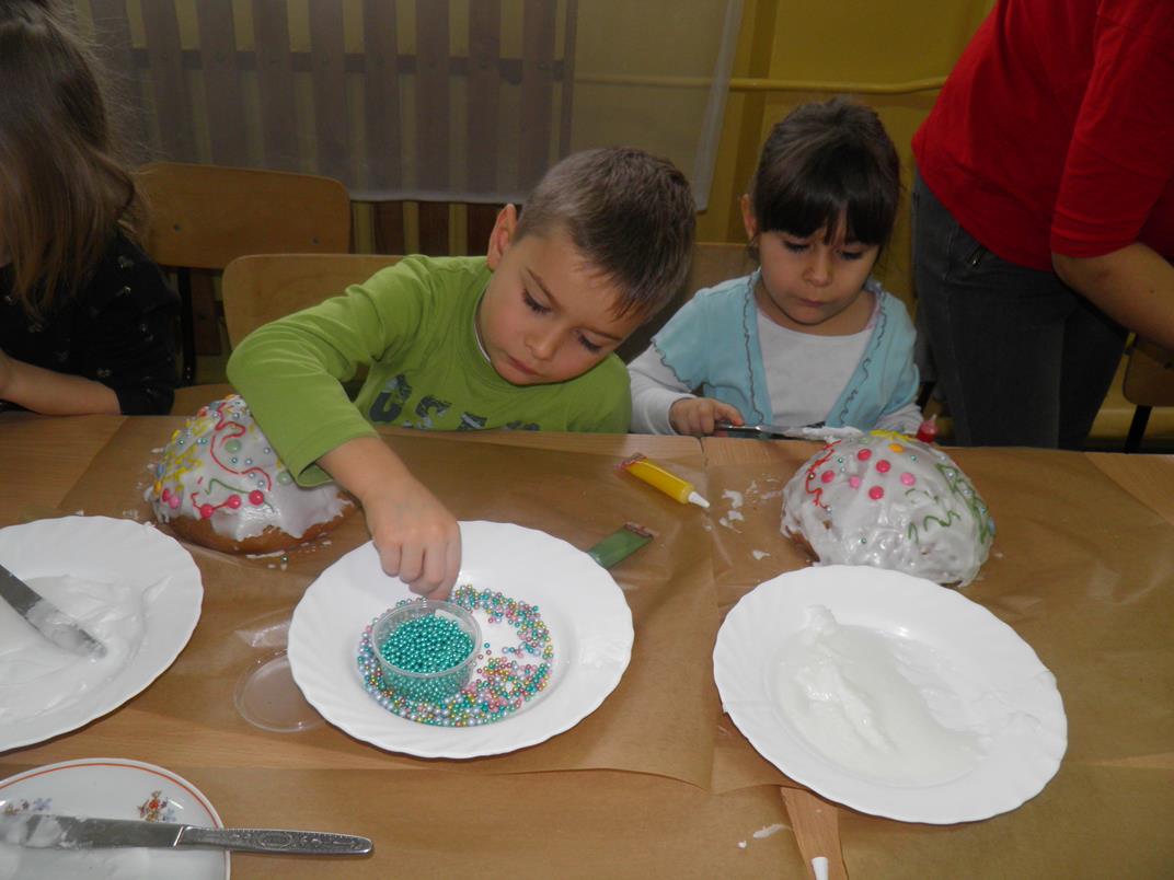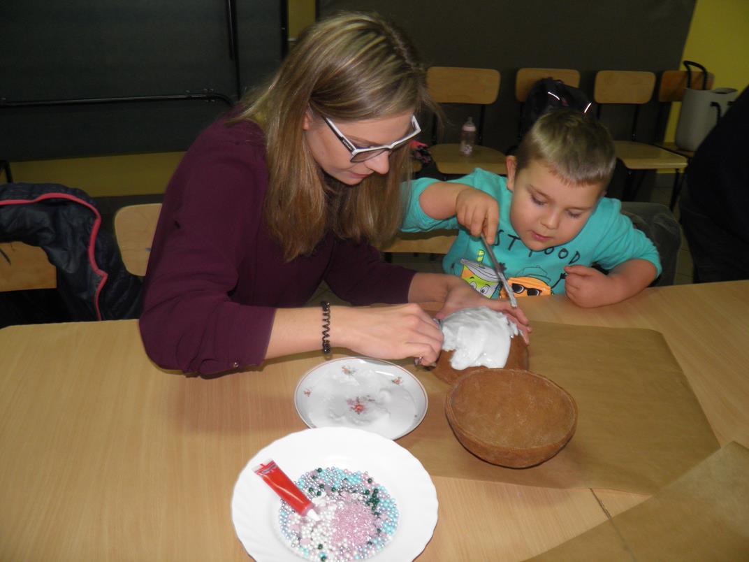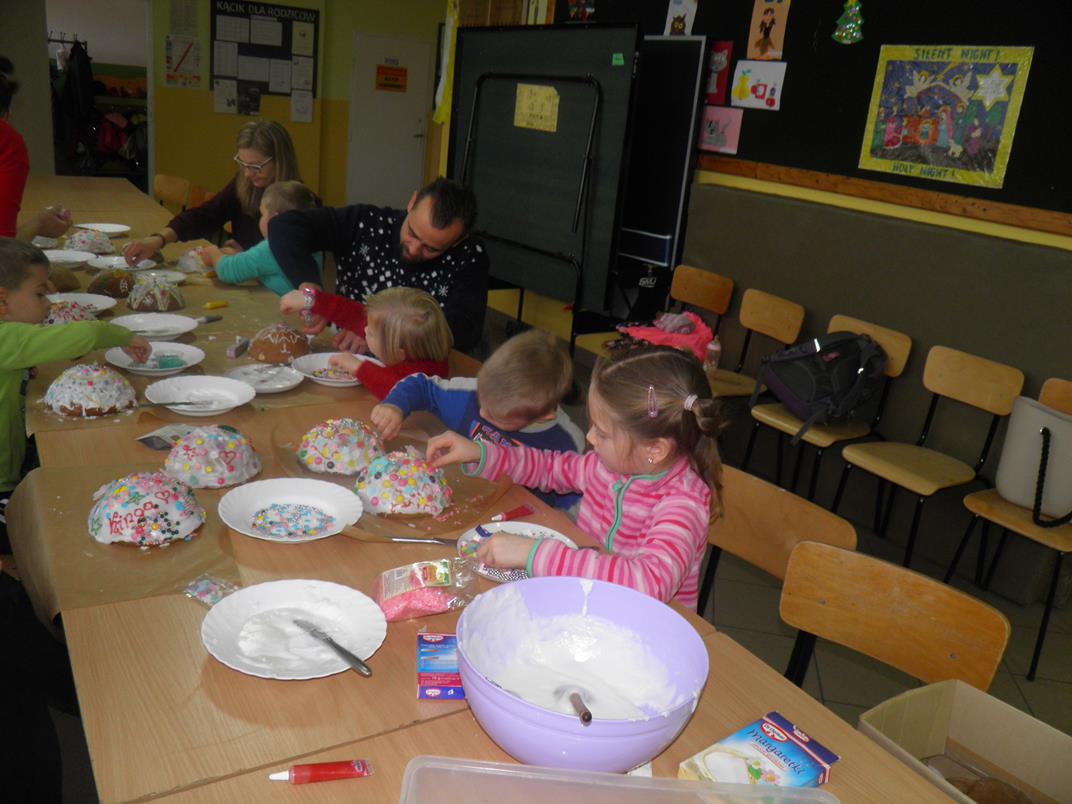Dnia 18 grudnia 2019r. w naszym przedszkolu odbyło się spotkanie poświęcone rozwijaniu i podtrzymywaniu świątecznej tradycji. Do dzieci przybyli rodzice, by wraz ze swoimi pociechami przygotować świąteczne ozdoby – bombki. Uczestnicy warsztatów wspólnie pokrywali piernikowe bombki lukrem, po czym ozdabiali je wybranymi przez siebie ozdobami. Dzieciaki z dużym zaangażowaniem uczyły się lukrować i ozdabiać piernikowe ciasto. Rodzice wspierali „młodych cukierników” i swoim przykładem zachęcali do rozwijania umiejętności artystycznych.