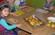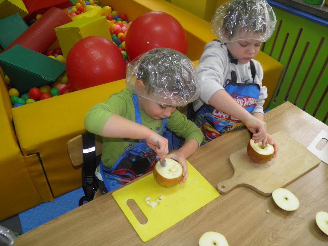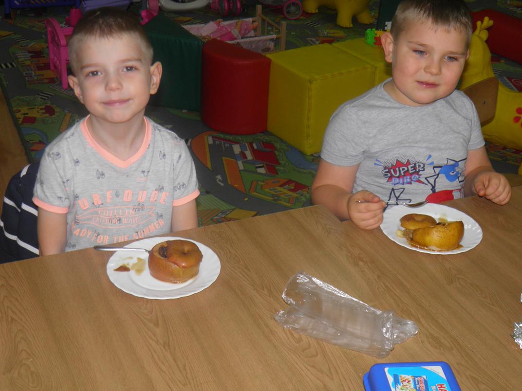Pod opieką Pani Kazimiery Ostrowskiej dzieci przypomniały sobie o zdrowotnych właściwościach jabłek, następnie przystąpiły do wykonania deseru. Umyły jabłka, łyżeczkami wydrążyły pestki i otworek na słodkie nadzienie. Wymieszały rodzynki z orzechami, napełniły wydrążone jabłka, polały miodem, a później zaniosły do pieczenia. Zajęcia skończyły się wspólną degustacją.
