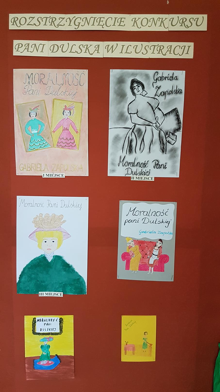 W ramach popularyzacji czytelnictwa 4 października 2021r. został rozstrzygnięty Szkolny Konkurs Plastyczny przeznaczony dla uczniów klasy VII i VIII pt. ,,Pani Dulska w ilustracji". Celem konkursu było promowanie czytelnictwa, rozwijanie wyobraźni, zainteresowań plastycznych oraz kształtowanie kreatywności. Zadaniem młodzieży było zaprojektowanie okładki do książki ,,Moralność pani Dulskiej" Gabrieli Zapolskiej. W konkursie wzięło udział sześcioro uczniów naszej szkoły.