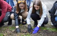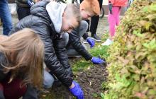 Sadzenie kwiatów rozpoczęliśmy od wyboru najlepszego w naszej ocenie miejsca, następnie wspólnie podzieleni na klasy uczniowie otrzymali cebulki żonkili i zasadzili je na przygotowanej rabacie. W działania włączyły się również dzieci oddziału przedszkolnego.