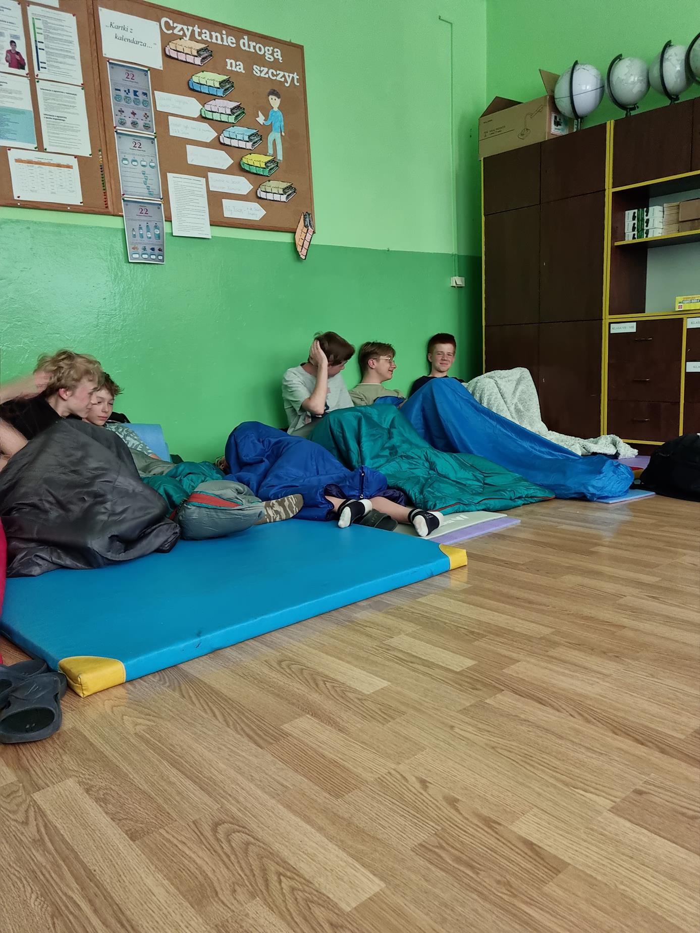 Tuż przed zakończeniem roku szkolnego uczniowie klas VI – VIII uczestniczyli w nocowaniu w szkole z piątku na sobotę. Wszyscy uczestniczy zebrali się w szkole około godziny 15.00 i zajęli się w pierwszej kolejności przygotowaniem poczęstunku oraz klas do noclegu. Następnie udali się na szkolne boisko, gdzie rozegrany został mecz siatkówki. W przerwie między setami „dotarła pizza”, był to znak, że należy rozpocząć poczęstunek.