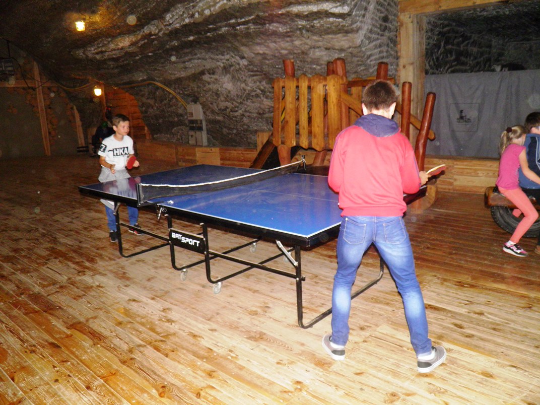 Ostatnim punktem atrakcji tego dnia była kopalnia soli w Bochni. Uczniowie dotarłszy na miejsce zjechali szybem 343 metry w dół. Po przejściu stromymi schodami doszli do podziemnej stołówki, gdzie przygotowano już ciepły posiłek dla uczestników wycieczki. W miejscu tym także uczniowie mogli spędzić miło czas na grze w piłkę nożną czy koszykówkę. Przewodnik, który oprowadzał uczniów po kopalni był zaciętym kibicem, dzięki czemu mieli oni okazję dopingować naszą drużynę piłkarzy przed zbliżającym się meczem z Niemcami. Gdy uczniowie zjedli obiad „pod powierzchnią ziemi” ruszyli dalej schodami tym razem w górę. Po przejściu około 40 m zostali podzieleni na dwie grupy, które były oprowadzane równolegle przez przewodników. Każda z grup ruszyła zwiedzać kopalnię i poznawać jej historię przedstawioną przy pomocy technik audiowizualnych. Pokaz przybliżył uczniom m. in. jak wyglądała praca górników dawniej i z jakimi trudnościami mieli do czynienia górnicy. Ostatnim etapem zwiedzania podziemnych tuneli kopalni był przejazd kolejką, jaką poruszali się dawniej górnicy. Na koniec wszyscy wrócili na powierzchnię szybem górniczym, po czym udali się do autokaru by wyruszyć w drogę powrotną. Choć zmęczeni po trudach pieszej wędrówki wycieczkę zaliczyć należy do bardzo udanych przedsięwzięć.